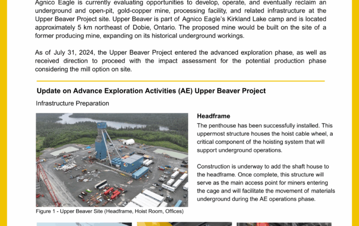 For information and the latest updates from the IAAC on the Impact Assessment process of the Upper Beaver Gold Project, visit iaac-aeic.gc.ca opens a new window.